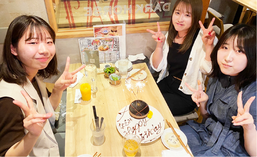 仕事帰りは友人や家族と夜ご飯を楽しんだり、休日は自宅でゲームをしながらドラマを見てリラックスしたりしています。仕事とプライベートのメリハリをつけることで、心身ともにリフレッシュでき、翌日からまた集中して業務に取り組むことができています。身近な人との時間を大切にしながら、自分のペースで過ごす時間が、日々の活力になっています。写真は、同期社員とご飯に行った時のものです!