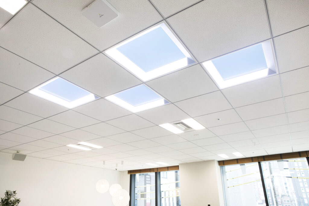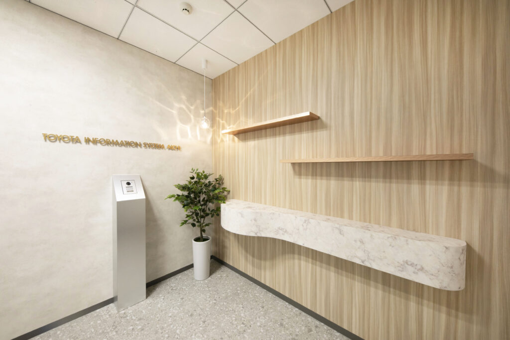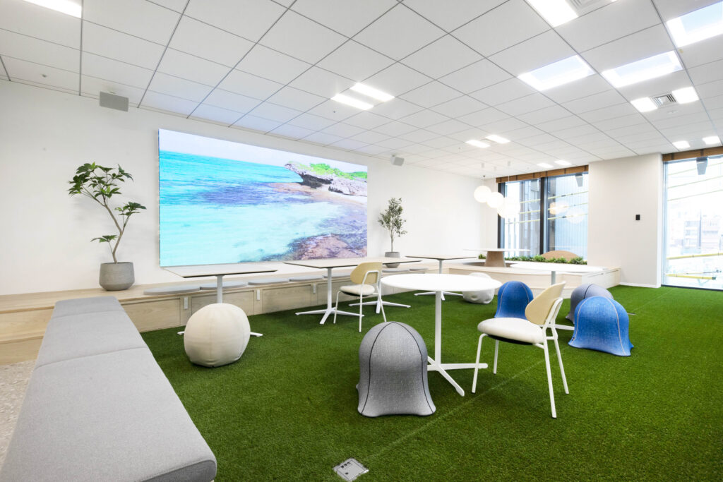 全ての社員が使用可能な執務スペース。壁に埋め込まれた大型ディスプレイを利用し、社内プレゼン会議も実施可能です。