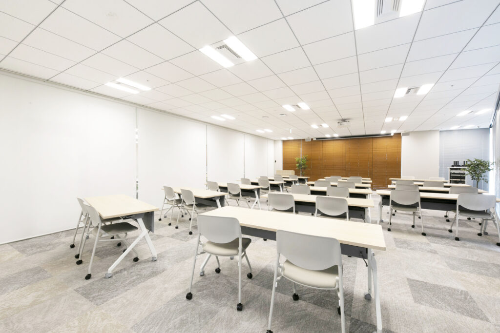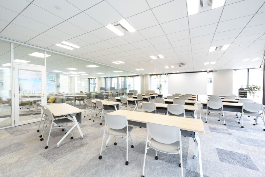 社員研修や採用イベントに利用する、大人数を収容できる会議室。職場毎の定例会議などにも使用されます。